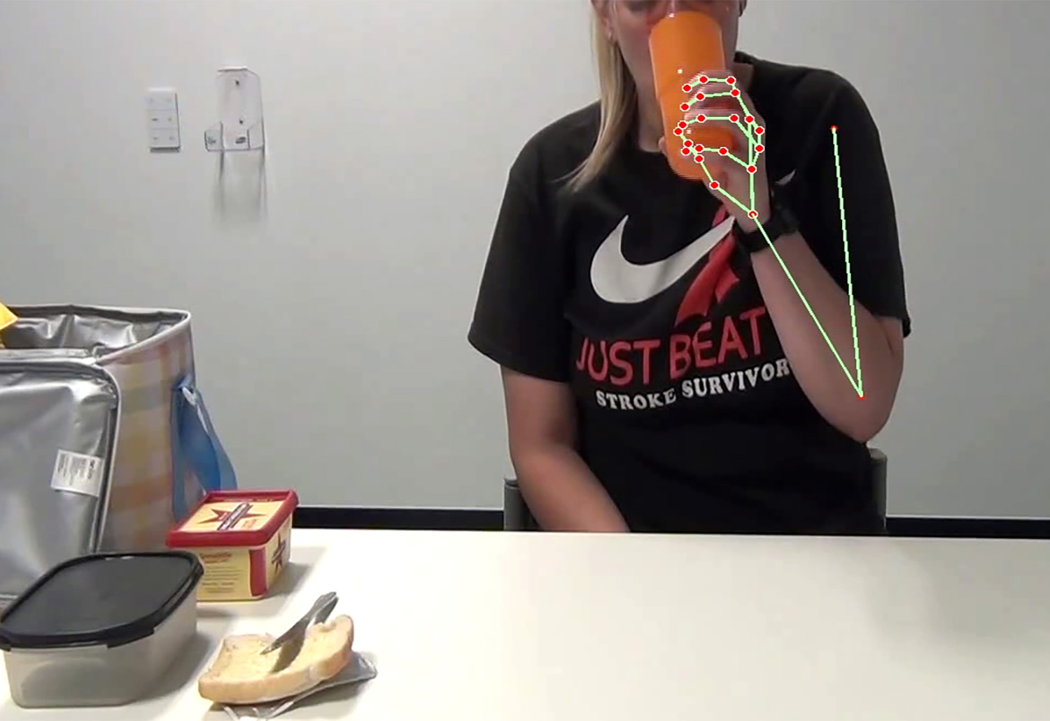 Innovative real time motion capture without physical markers (computer vision). We use ‘computer vision’ science, which is a field of AI that allows us to ‘see’ and interpret images and videos. Our team have developed a novel web-based NeuroSmart Assessor (NSA) to help us capture quality and movement patterns of the upper limb. Importantly we can do this remotely without any equipment other than the internet. For example, during an assessment or therapy zoom meeting, a person might show us how they can drink from a cup or how they are performing their chosen activity. We can use a virtual exoskeleton to help capture the movement in real time from the video image. This can all be done in the comfort of their own home. We can then measure quality of movement, such as movement pattern, wrist speed, fingertip trajectories, movement smoothness, so that we can monitor recovery and provide feedback.